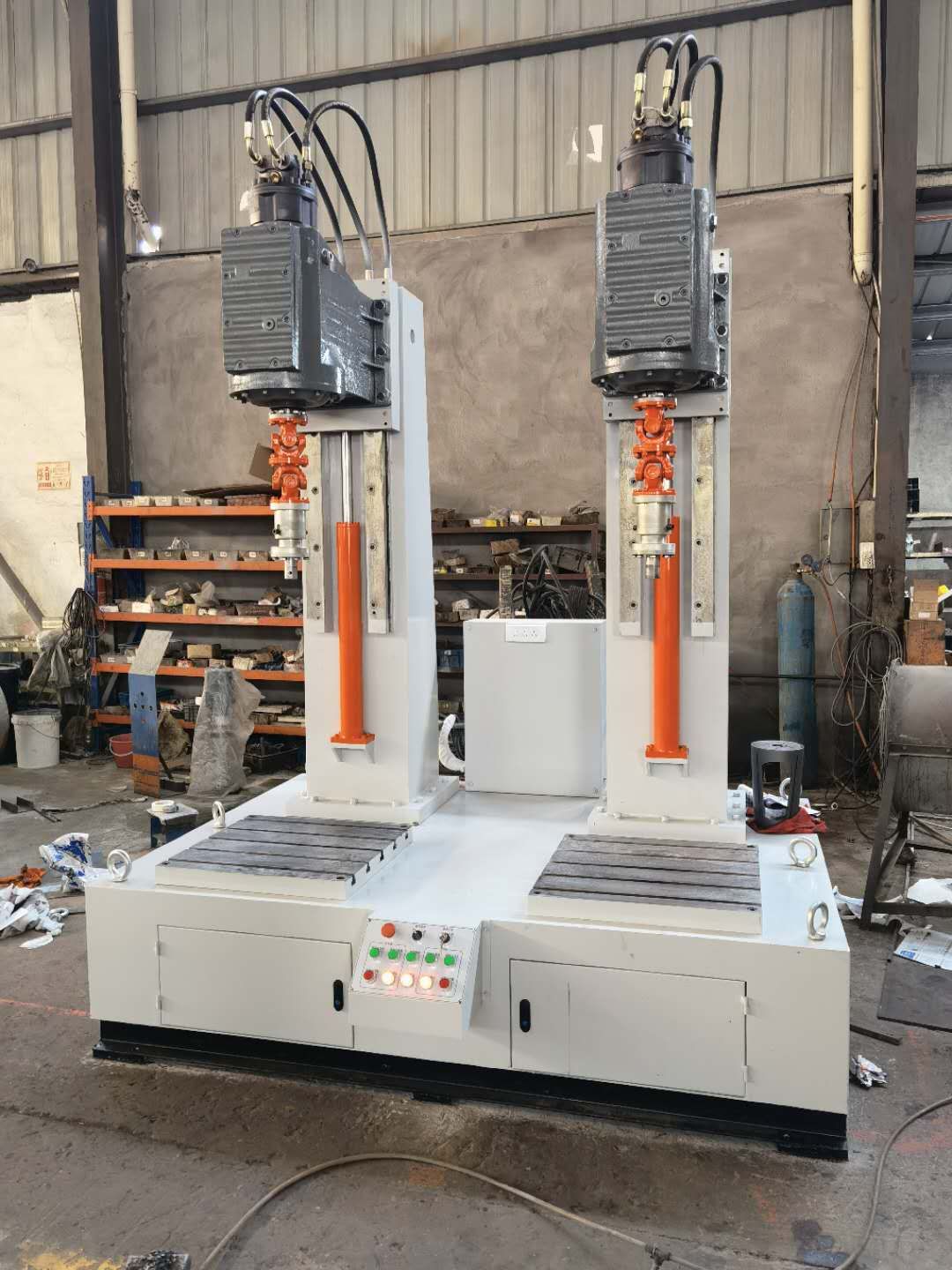 JLX型旋塞阀研磨机是针对硬密封旋塞阀密封面的研磨而精心研制的专用设备,该设备采用独创的正转360度和反转360度,最主要的是正反转一圈还有上下起跳5次功能方式,上下起跳功能就是解决了阀体密封面和阀芯塞密封面不会咬伤和损坏。获得极高的加工精度、表面质量以及批量加工的质量一致性。JLX型旋塞阀研磨机分为一工位和两工位研磨机、一工位研磨机和两工位研磨机供用户可根据要求选配。该设备通过液压马达来控制转速旋转,用液压流量来控制转速快与慢,根据阀门口径大小和材质来调整转速快慢,这样才阀体和阀芯塞配合度为一致。用户根据被研磨阀体的工艺要求,选择合适的研磨剂,粗磨和精磨相结合,或阀体与阀芯塞浮动对磨。研磨头通过液压油缸来上升下降来实现。齿轮箱与主轴采用万向节与伸缩杆链接,旋塞阀阀体和阀芯塞的垂直通过万向节来变动,阀体和阀芯塞用伸缩杆来控制密封面的轻重来实现。装夹误差或其它工艺误差。研磨剂根据用户来选择。JLX型旋塞阀研磨机由立柱机架、导轨及升降机构、齿轮箱旋转机构、装夹机构等组成,旋转机构的旋转中心线相互垂直。立柱与齿轮箱底板的升降功能通过液压油缸来实现,通过按钮可进行上升或下降。