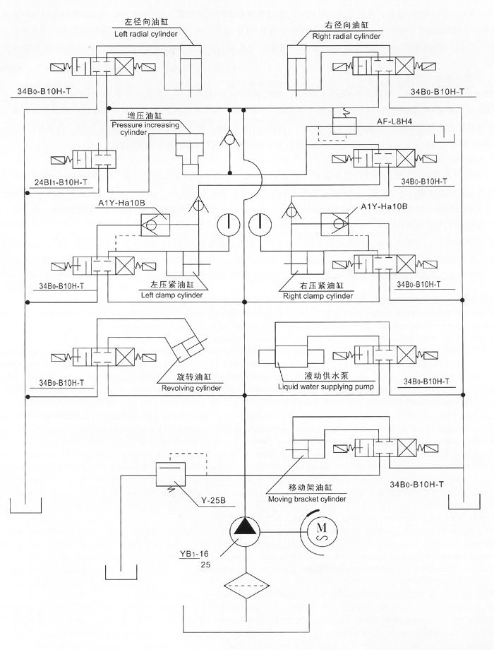 三、接通电源,按油泵启动按钮,检查电机转动方向,是否正确(顺时针方向)进行5—1 O分钟空载运转后,调节油泵压力在5 0MPa进行试机,各种动作,检查各管路有无泄漏,发现不良现象,应立即停机排除。