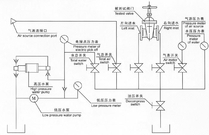 调整水源电接点压力表,水泵开关<低压水泵>开,先把被试阀门内部水注满,低水压力表为O 5MPa内水已满,关掉水泵开关<低压水泵>关。再按<高压水泵开>调节供水泵压力调节阀,<供水泵,液压系统减压阀J一25B>把液体试压压力达到和被试阀门密封压力及电接点压力表值相同时,高压水泵就自动停机,关闭 <;总水开关>。保压数分钟后,水压表无下降,测试密封完毕,开<泄压开关 >,将被试阀门内的压力泄压,<水压表>为零,可以放松被试阀门或同时继续进行强度测试。